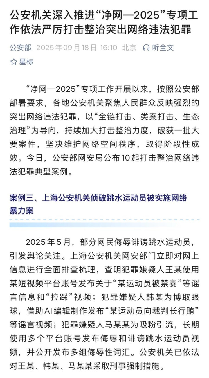2025年9月,公安部网安局已将跳水运动员被网暴案列为打击整治网络违法犯罪典型案例,三名造谣者被采取刑事强制措施,释放出“网络不是法外之地”的强烈信号。2026年中央政法工作会议更明确部署,推进“净网”专项行动,依法打击治理网络谣言、网络暴力等乱象。