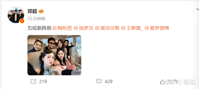 4月11日,爱搞事情的邓超在个人社交平台晒出与陶昕然、徐梦洁、任敏、王影璐、夏梦五位女嘉宾的合影,并声称是五哈新阵容。合影是在车上拍的,6个人的合影只有邓超一位男士,可谓是被美女簇拥,难怪邓超要发个动态得瑟一把。