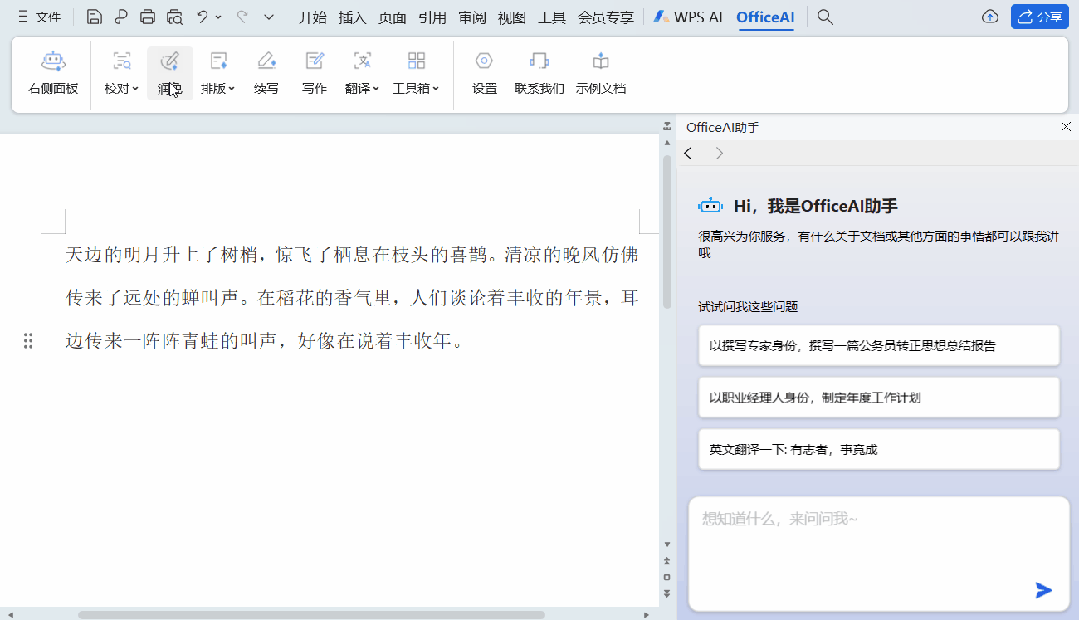 说到功能,写周报、开会记个纪要、做内容、文案润色……咱们哪个打工人没被这些小活逼疯过?AI助手住在你右侧的工具栏,化身文字对话机器人,随手丢几句话,周报咻咻就写好,仿佛背后无数智囊团加持——横批懒人福音!校对文本错别字、标点符号能挑出来,比语文老师都狠毒;内容平淡?一键润色,分分钟高大上,“让生活充满诗意”原来不只诗人才能拥有。更骚的是还能来个润色前后大对比,手把手教你修辞,连干巴巴的领导发言稿都能改得像情书。