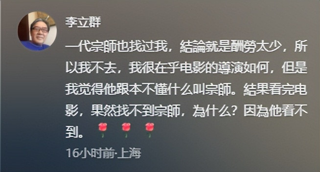 “《一代宗师》也找过我,酬劳太少我没去,我觉得他根本不懂什么叫宗师,看完电影,电影里也找不到宗师,因为他看不到。”