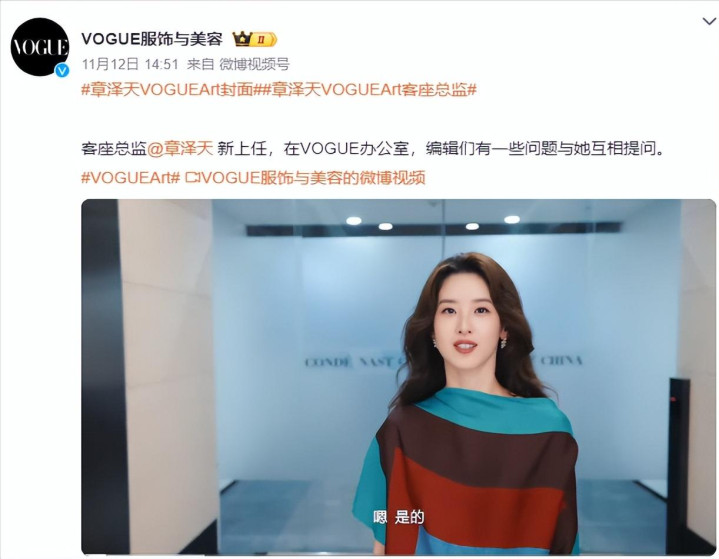 相比这个头衔本身,更让网友们津津乐道的,是那支别出心裁的入职 vlog。视频采用问答的方式,由 Vogue 员工一连串抛出尖锐问题,章泽天则在镜头前不慌不忙,认真回答又保持从容,甚至还展现出以前很少被看到的幽默感。